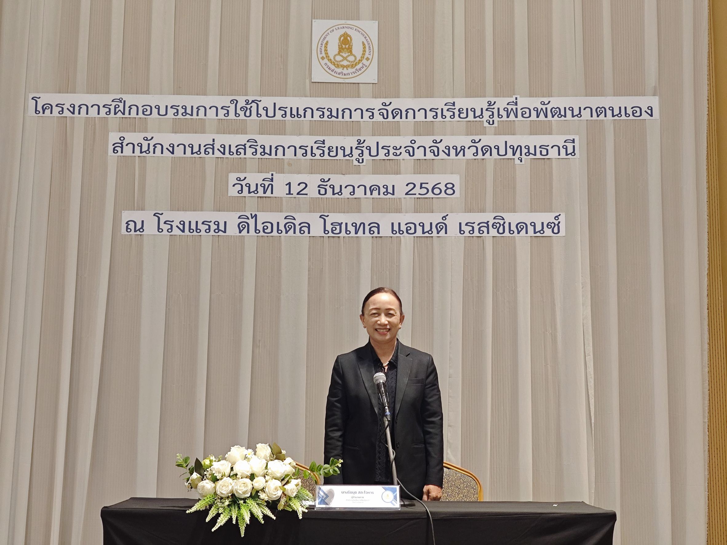 นางรัชนุช สละโวหาร ผู้อำนวยการสำนักงานส่งเสริมการเรียนรู้ประจำจังหวัดปทุมธานี เป็นประธานในพิธีเปิด โครงการฝึกอบรมการใช้โปรแกรมการจัดการเรียนรู้เพื่อพัฒนาตนเอง เพื่อส่งเสริมบุคลากรในสังกัดให้มีความรู้ ความเข้าใจในการใช้งานโปรแกรมด้านการเรียนรู้ผ่านระบบออนไลน์ พร้อมยกระดับคุณภาพการให้บริการการศึกษาแก่ประชาชน
