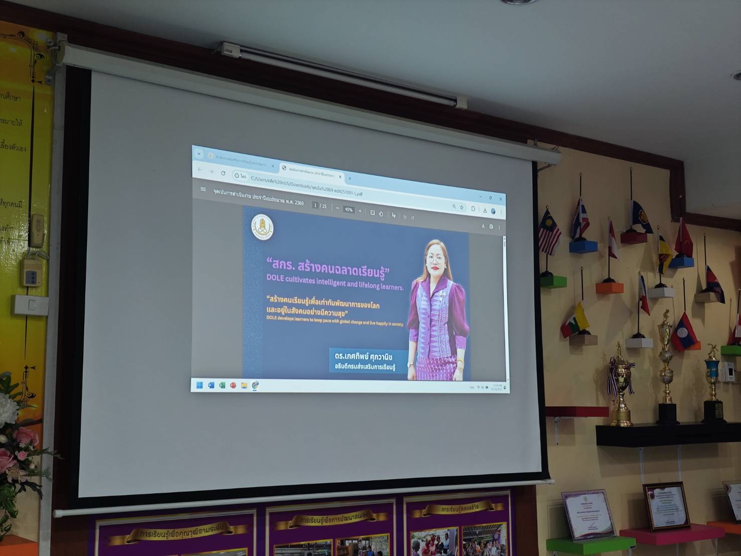 “สร้างคนเรียนรู้เพื่อเท่าทันพัฒนาการของโลก และอยู่ในสังคมอย่างมีความสุข” (DOLE develops learners to keep pace with global change and live happily in society)
